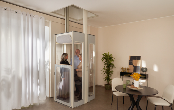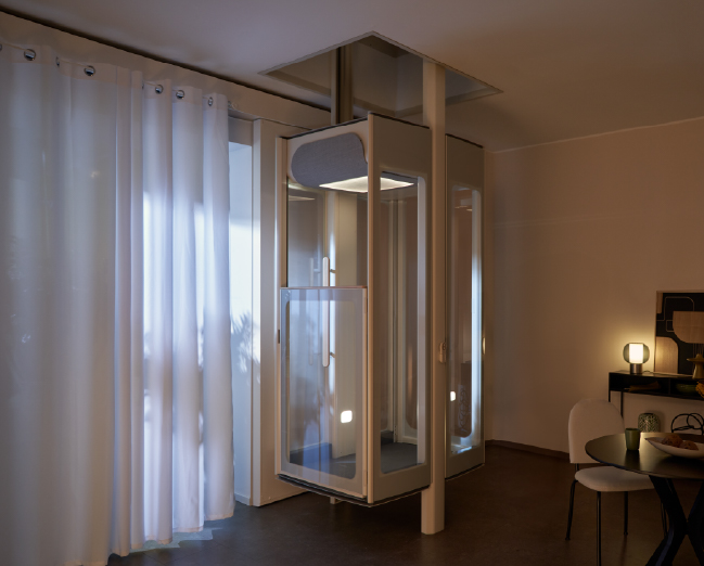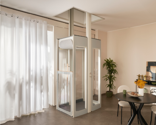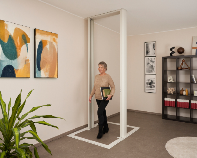 Είναι ιδανικό για τη μεταφορά έως και 3 ατόμων ή ενός ατόμου σε αναπηρικό αμαξίδιο, ενώ παραμένει εκπληκτικά συμπαγές αλλά με αίσθηση ευρυχωρίας, χάρη στον μοναδικό και κομψό σχεδιασμό του. Είναι ελεύθερης τοποθέτησης λόγω της σπονδυλωτής κατασκευής του, επιτρέποντας την εγκατάσταση σε οποιοδήποτε σημείο του σπιτιού.
